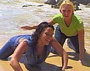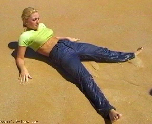 away. They play in the surf, admiring each other's jeans and wet