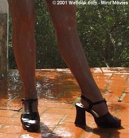 short, pleated skirt, which sticks tightly to her backside. The water travels