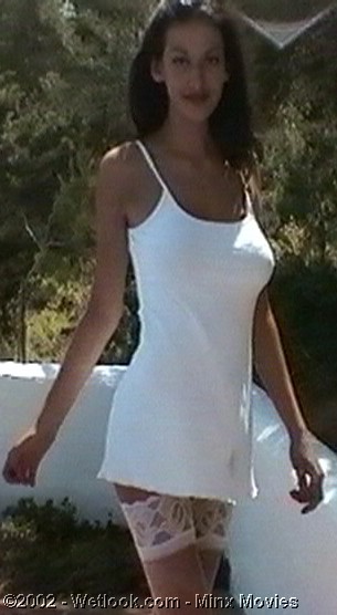 She walks up showing off her wet dress clinging to her ripe backside, before fully submerging and showing her stocking tops and suspender belt.